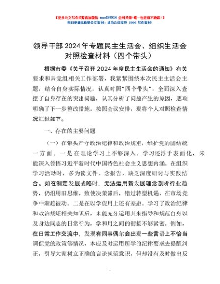 / 领导干部2024年专题民主生活会、组织生活会对照检查材料(四个带头)