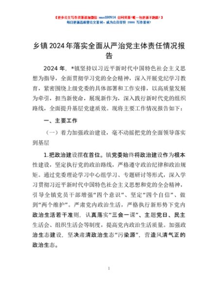 / 乡镇2024年落实全面从严治党主体责任情况报告