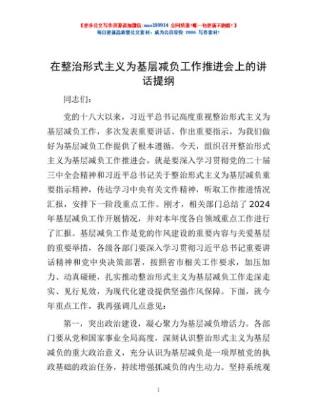 / 在整治形式主义为基层减负工作推进会上的讲话提纲