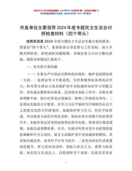 / 市直单位主要领导2024年度专题民主生活会对照检查材料(四个带头)