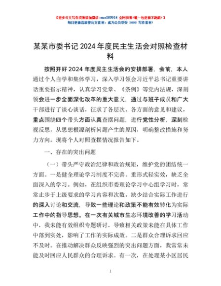 / 某某市委书记2024年度民主生活会对照检查材料