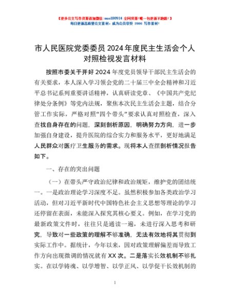 / 市人民医院党委委员2024年度民主生活会个人对照检视发言材料