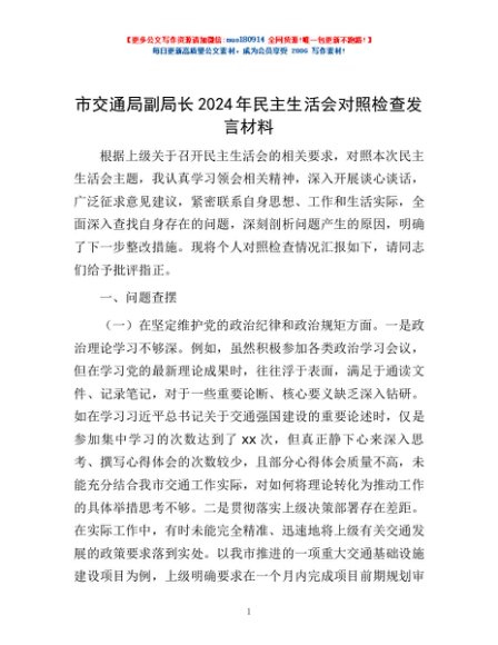 / 市交通局副局长2024年民主生活会对照检查发言材料