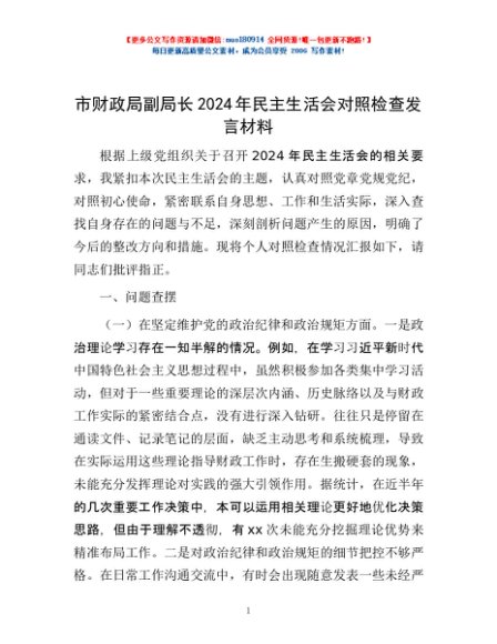 / 市财政局副局长2024年民主生活会对照检查发言材料