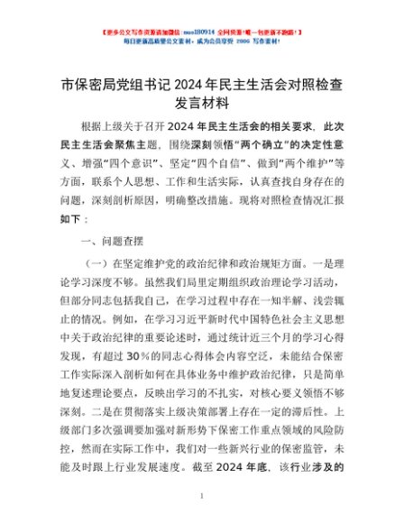 / 市保密局党组书记2024年民主生活会对照检查发言材料
