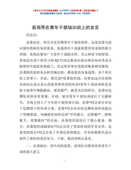 / 县领导在青年干部培训班上的发言