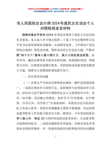 / 市人民医院总会计师2024年度民主生活会个人对照检视发言材料