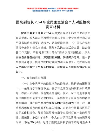 / 医院副院长2024年度民主生活会个人对照检视发言材料