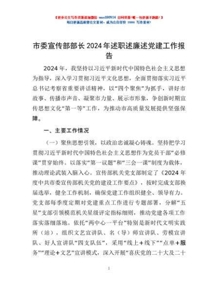 / 市委宣传部部长2024年述职述廉述党建工作报告