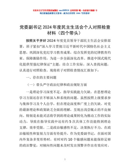 / 党委副书记2024年度民主生活会个人对照检查材料(四个带头)