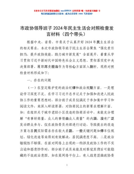 / 市政协领导班子2024年民主生活会对照检查发言材料(四个带头)
