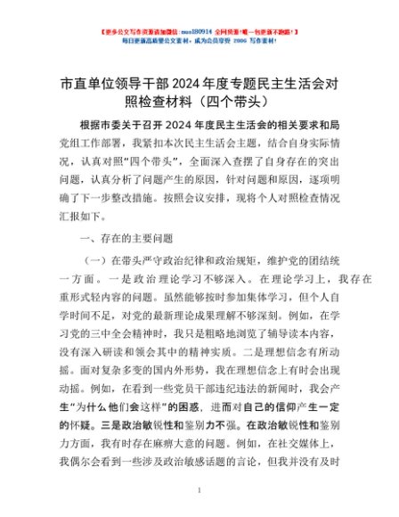 / 市直单位领导干部2024年度专题民主生活会对照检查材料(四个带头)