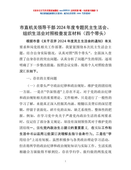 / 市直机关领导干部2024年度专题民主生活会、组织生活会对照检查发言材料(四个带头)