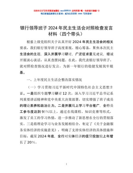 / 银行领导班子2024年民主生活会对照检查发言材料(四个带头)
