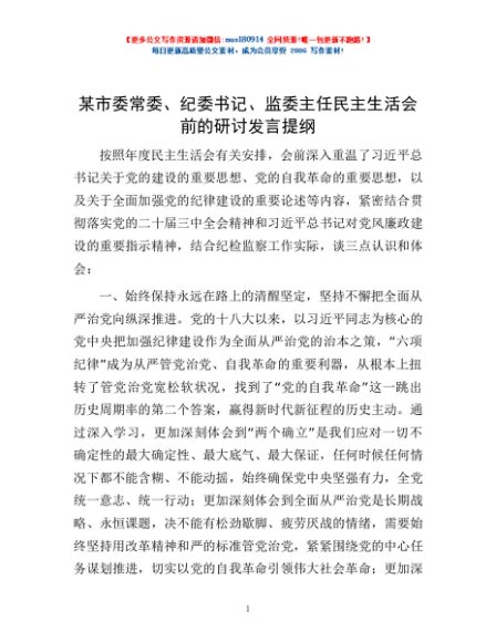 / 某市委常委、纪委书记、监委主任民主生活会前的研讨发言提纲