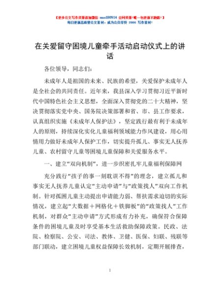 / 在关爱留守困境儿童牵手活动启动仪式上的讲话