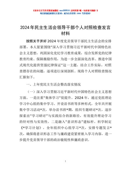 / 2024年民主生活会领导干部个人对照检查发言材料