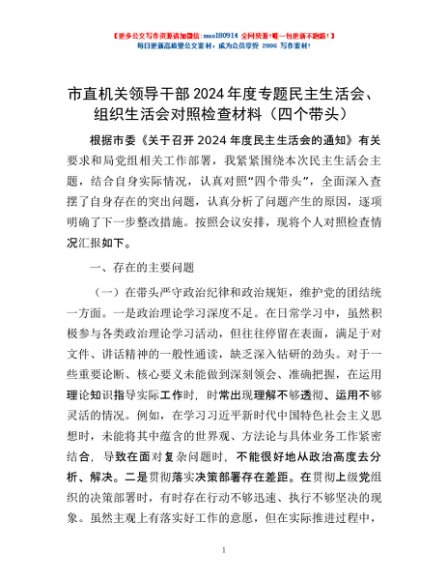 / 市直机关领导干部2024年度专题民主生活会、组织生活会对照检查材料(四个带头)