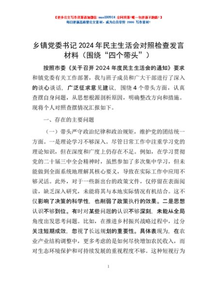 / 乡镇党委书记2024年民主生活会对照检查发言材料(围绕“四个带头”)