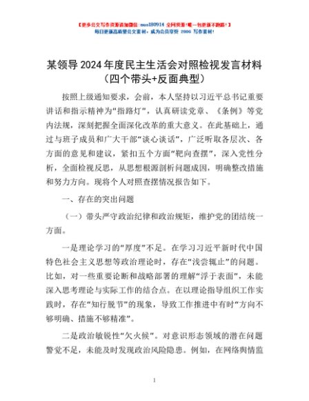 / 某领导2024年度民主生活会对照检视发言材料(四个带头+反面典型)