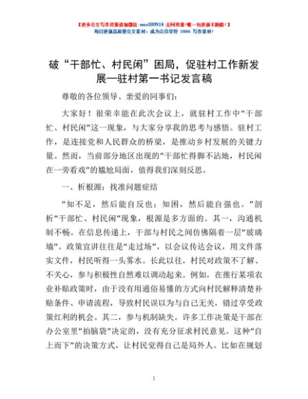 / 破“干部忙、村民闲”困局,促驻村工作新发展—驻村第一书记发言稿