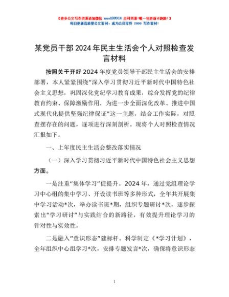 / 某党员干部2024年民主生活会个人对照检查发言材料