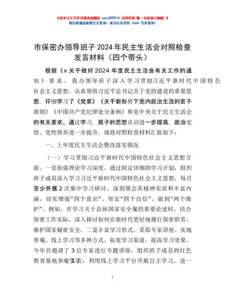 / 市保密办领导班子2024年民主生活会对照检查发言材料(四个带头)