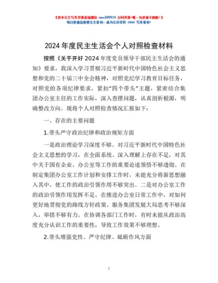 市直机关领导干部2024年专题民主生活会、组织生活会对照检查材料(四个带头)