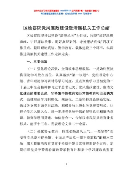/ 区检察院党风廉政建设暨清廉机关工作总结