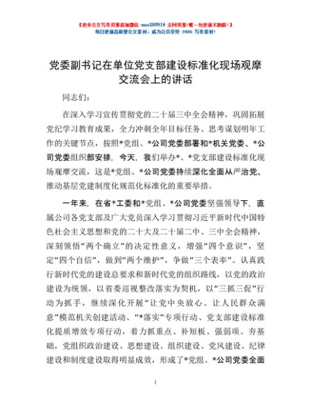 / 党委副书记在单位党支部建设标准化现场观摩交流会上的讲话