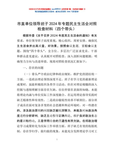 / 市直单位领导班子2024年专题民主生活会对照检查材料(四个带头)