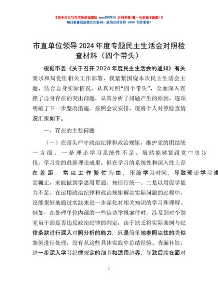 / 市直单位领导2024年度专题民主生活会对照检查材料(四个带头)