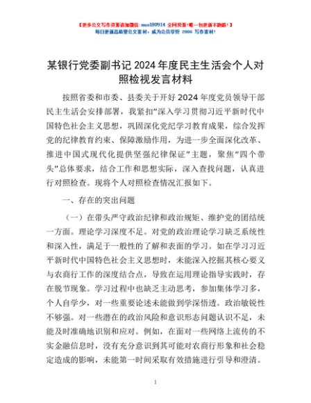 / 某银行党委副书记2024年度民主生活会个人对照检视发言材料