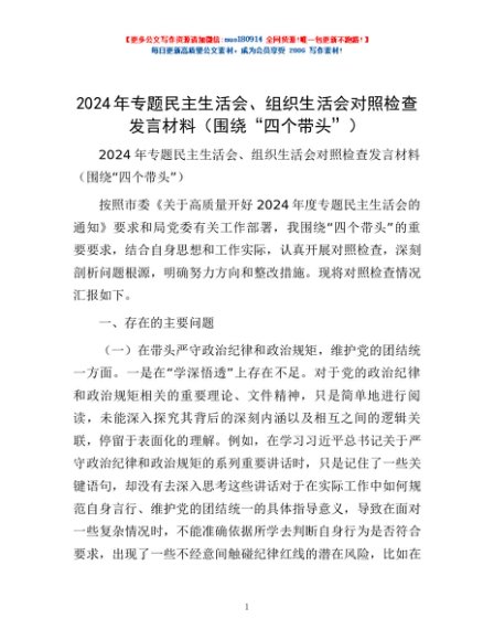 / 2024年专题民主生活会、组织生活会对照检查发言材料(围绕“四个带头”)