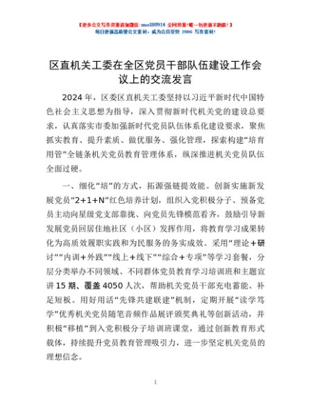 / 区直机关工委在全区党员干部队伍建设工作会议上的交流发言