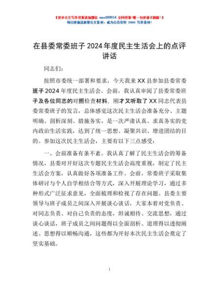 / 在县委常委班子2024年度民主生活会上的点评讲话