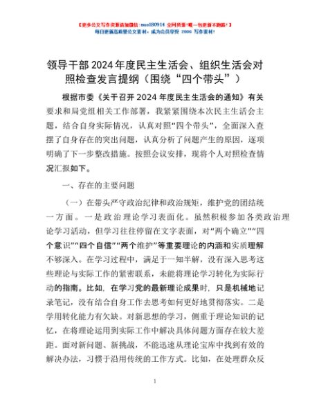 / 领导干部2024年度民主生活会、组织生活会对照检查发言提纲(围绕“四个带头”)