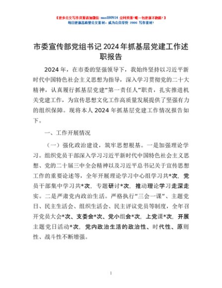 / 市委宣传部党组书记2024年抓基层党建工作述职报告