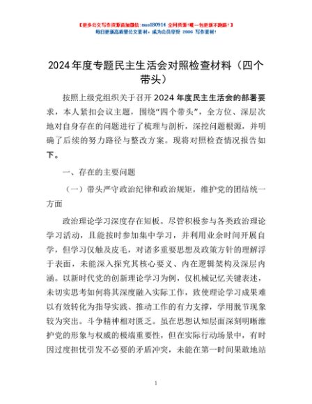 / 2024年度专题民主生活会对照检查材料(四个带头)