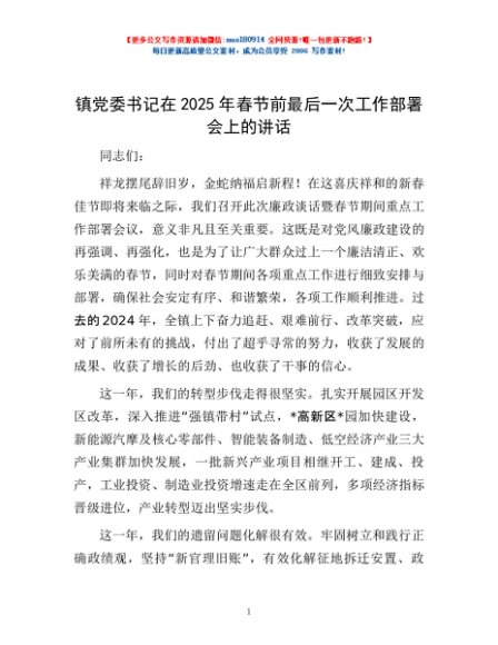 / 镇党委书记在2025年春节前最后一次工作部署会上的讲话