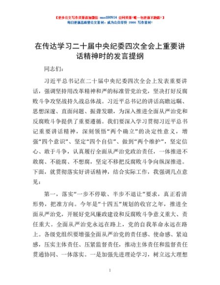/ 在传达学习二十届中央纪委四次全会上重要讲话精神时的发言提纲