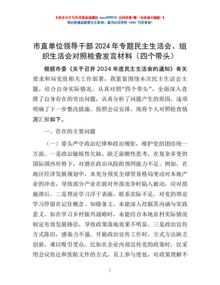 / 市直单位领导干部2024年专题民主生活会、组织生活会对照检查发言材料(四个带头)