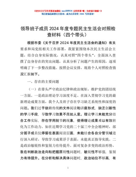 / 领导班子成员2024年度专题民主生活会对照检查材料(四个带头)