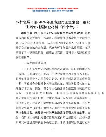 / 银行领导干部2024年度专题民主生活会、组织生活会对照检查材料(四个带头)