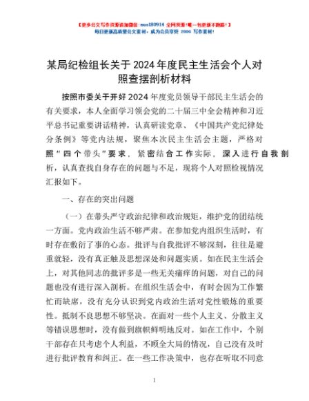 / 某局纪检组长关于2024年度民主生活会个人对照查摆剖析材料