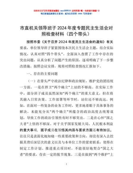 / 市直机关领导班子2024年度专题民主生活会对照检查材料(四个带头)
