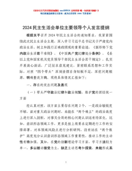 / 2024民主生活会单位主要领导个人发言提纲