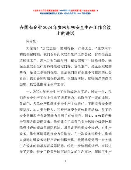 / 在国有企业2024年岁末年初安全生产工作会议上的讲话