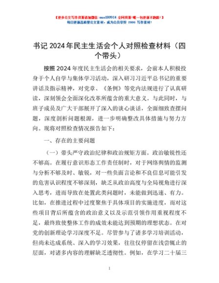 / 书记2024年民主生活会个人对照检查材料(四个带头)