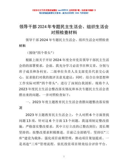 / 领导干部2024年专题民主生活会、组织生活会对照检查材料